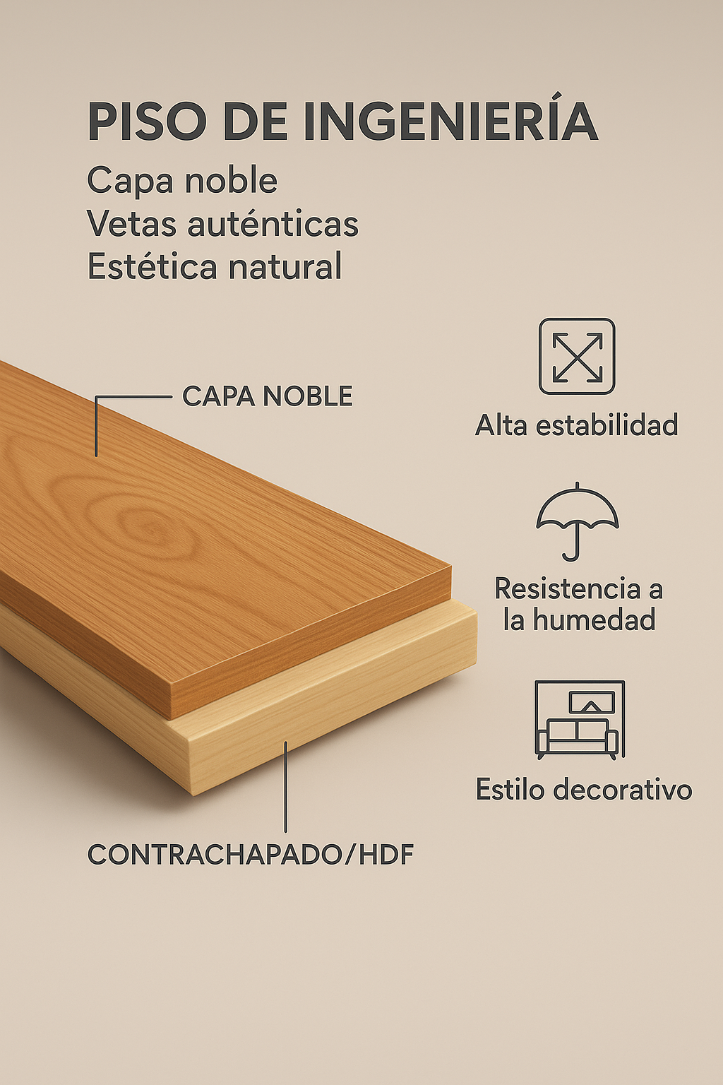Este material tiene una capa noble de 3 mm, 4 mm o hasta de 6 mm, montada sobre contrachapado/HDF, con vetas auténticas y una estética natural; esto la hace muy estable dimensionalmente frente a la madera maciza, y soporta humedad relativa sin deformaciones.