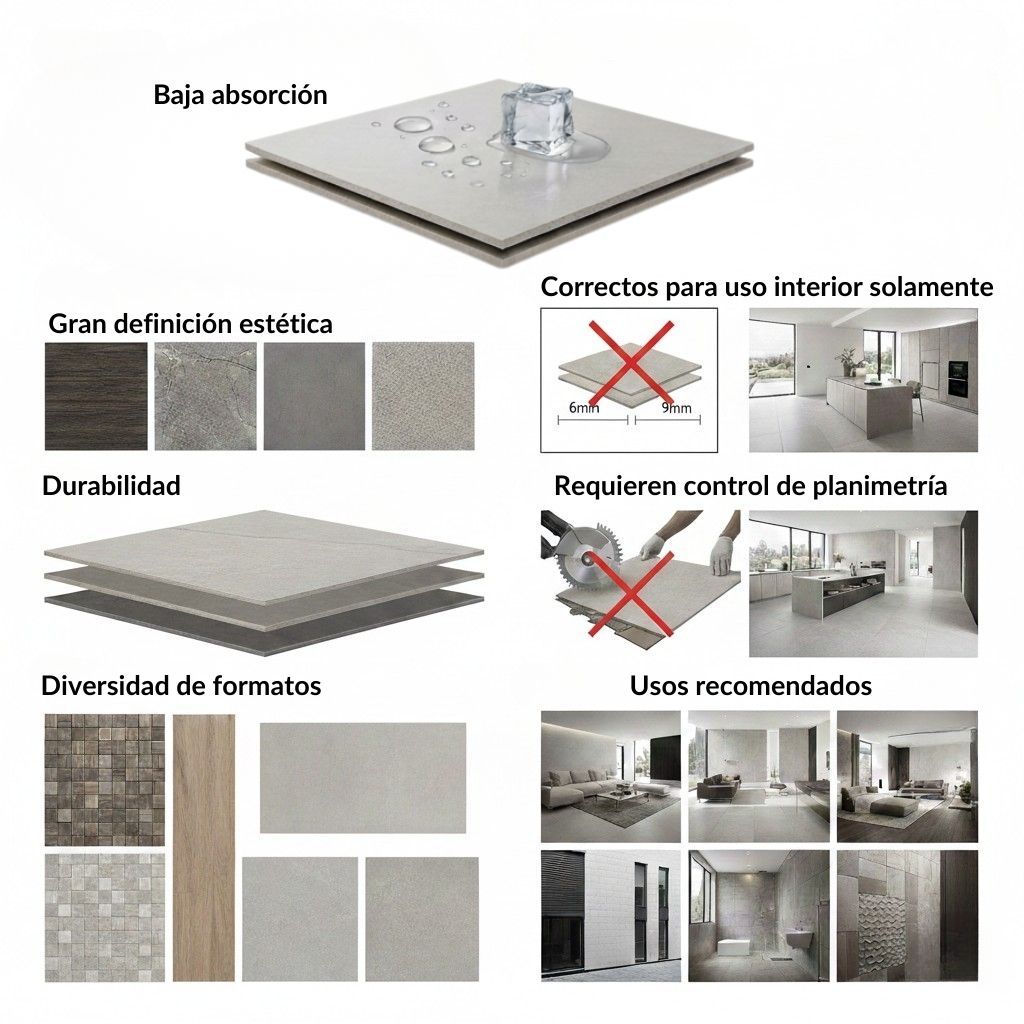 | Atributo | Porcelanato (6–9 mm) | Cerámicos (WOW) |
