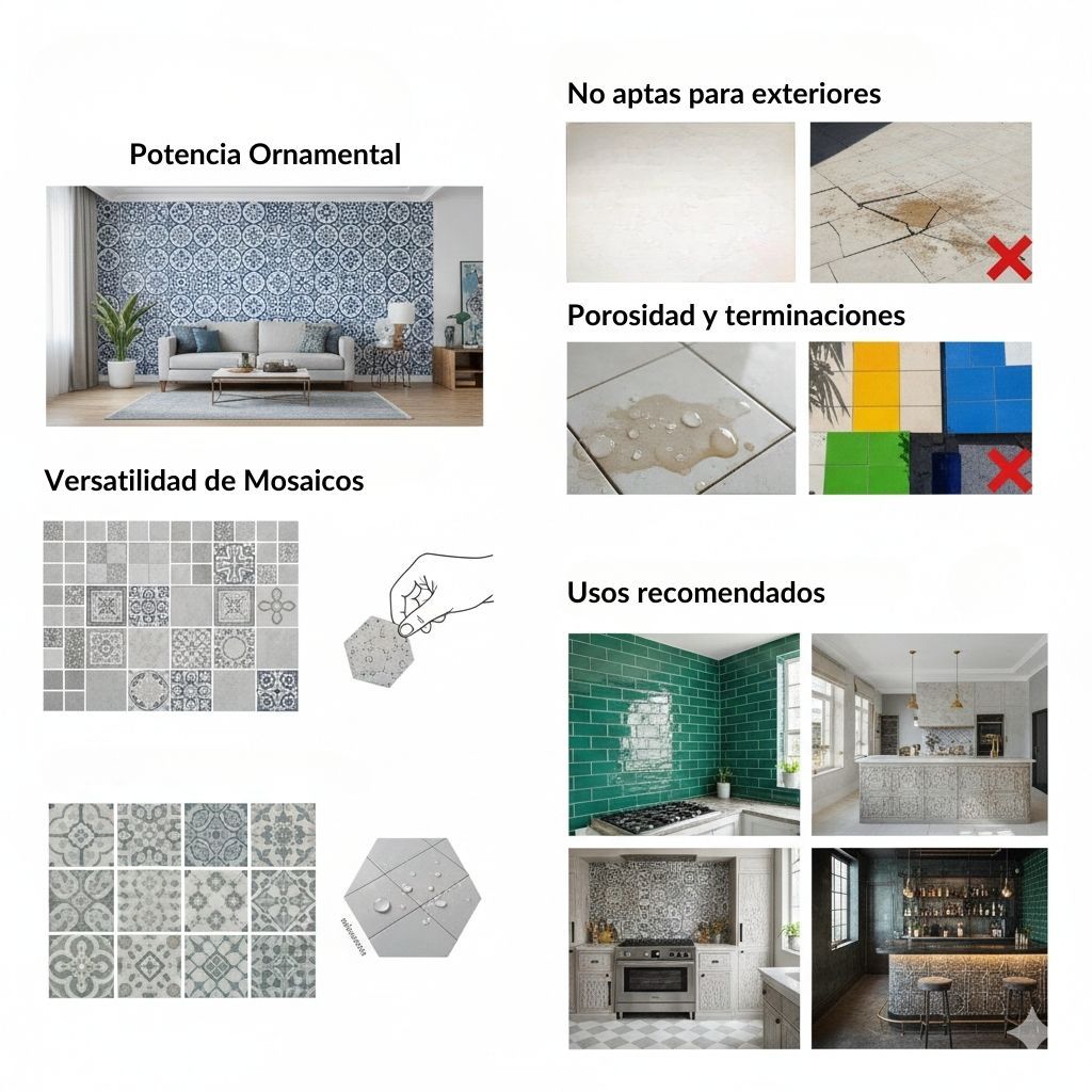 - No todas las colecciones son aptas para exteriores y zonas de mucho sol: muchas piezas están pensadas para muros o tráfico ligero —si se usan en piso conviene verificar PEI y resistencia a abrasión.