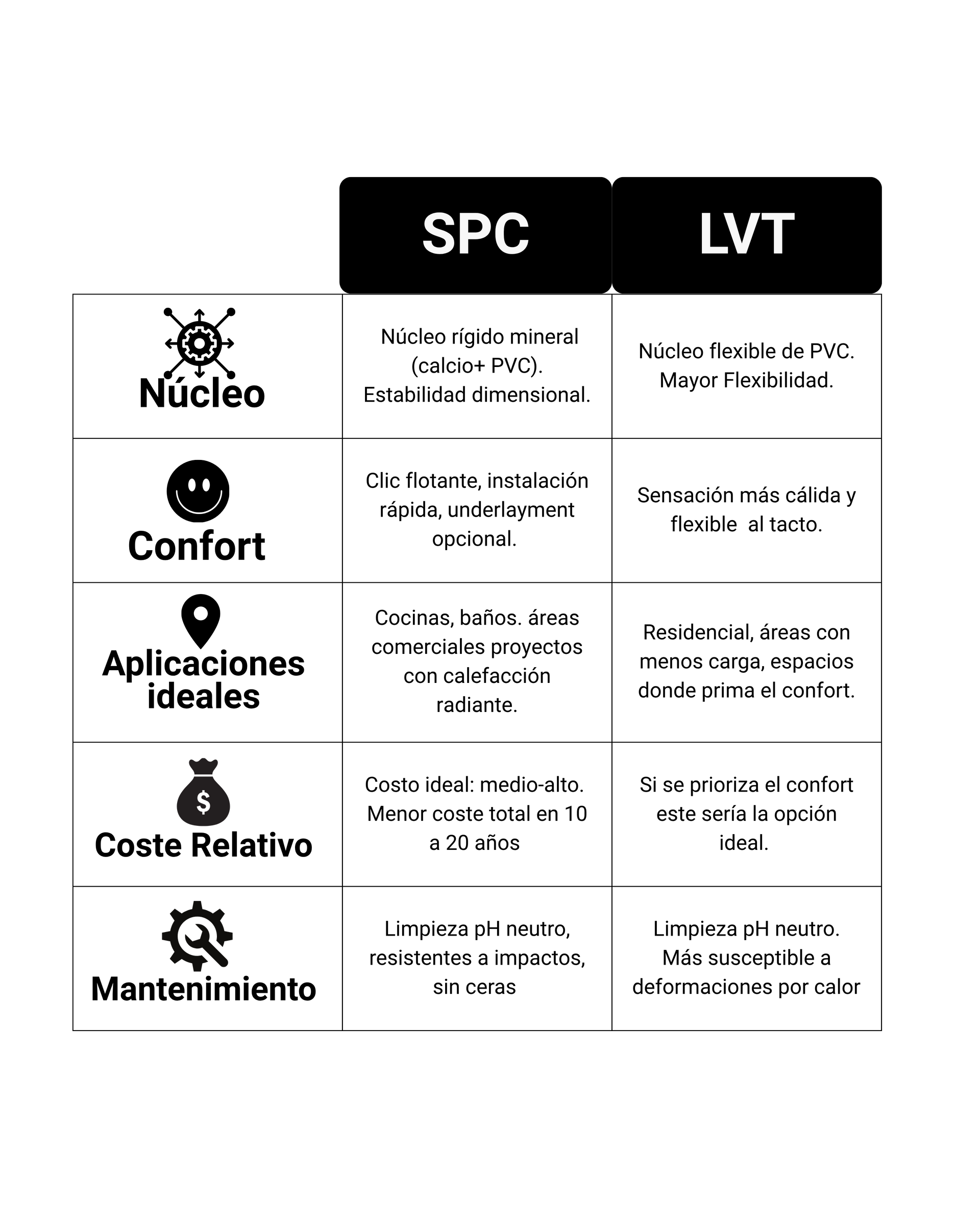 el LVT es perfectamente válido y a veces más económico. En Pygma les recomendamos ofrecer SPC como primera opción técnica, siempre acompañando con ficha técnica, muestra física y cálculo de coste total de propiedad.