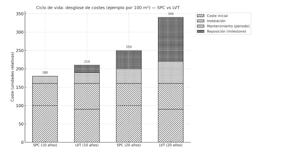 Según análisis de coste de propiedad, las soluciones vinílicas (incluyendo SPC y LVT) ofrecen muy buen balance entre inversión y mantenimiento; la decisión recae en la prioridad: confort (LVT) vs. durabilidad/estabilidad (SPC).