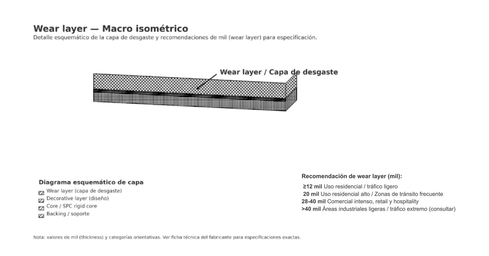 En el SPC, la capa UV y capa de desgaste determinan la vida útil frente a rayado; con el LVT, si se va a tener un tránsito intenso, se recomienda escoger una capa de desgaste de 20–28 mil o más. Se recomienda siempre seguir las recomendaciones del fabricante (limpieza, tránsito, zoclos, etc.).
