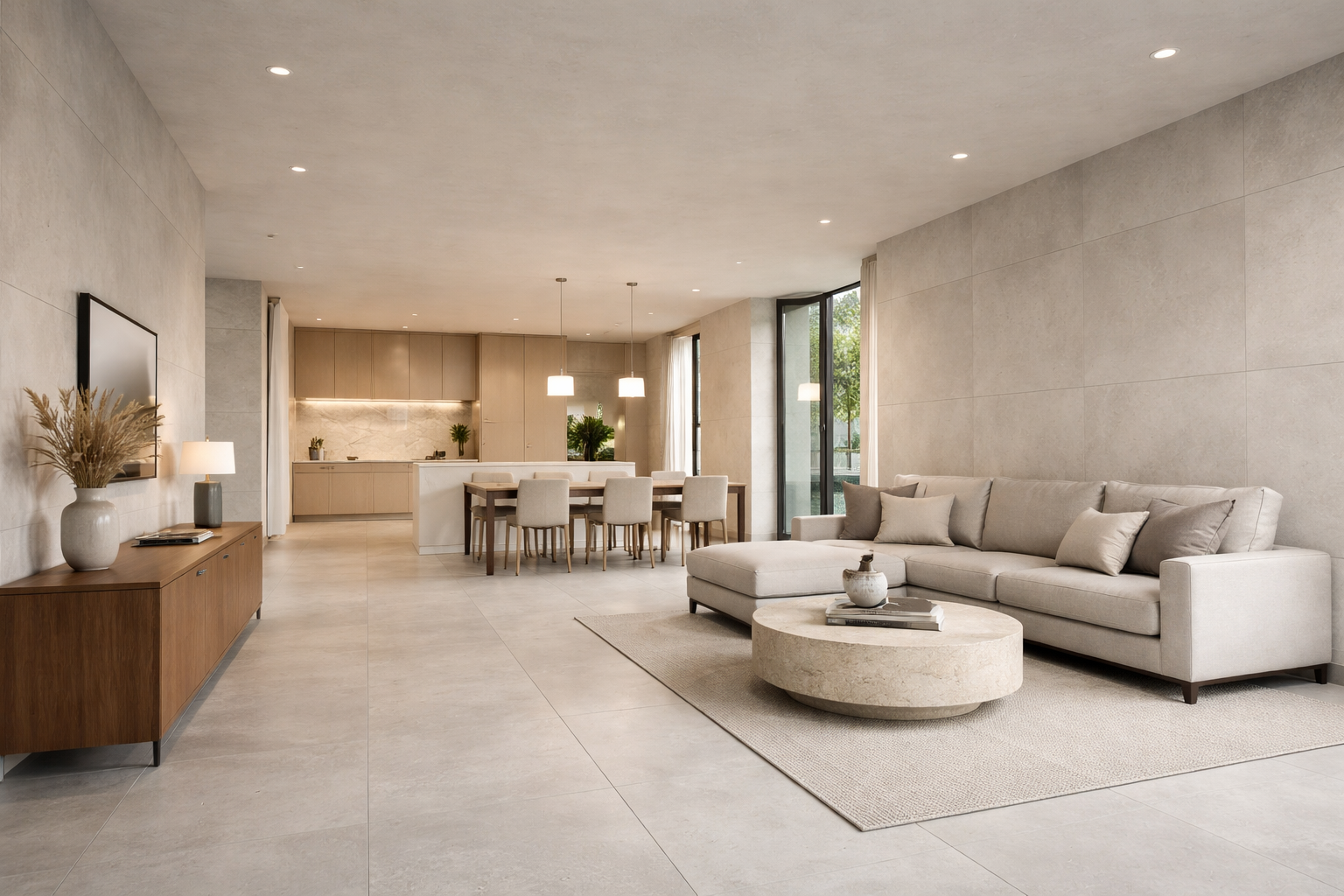 porcelanatos de gran formato se han convertido en uno de los materiales favoritos de arquitectos e interioristas. Gracias a su baja absorción de agua, su resistencia y la diversidad de acabados disponibles —piedra, concreto, mármol o madera— el porcelanato permite resolver tanto pisos como muros con una estética coherente.