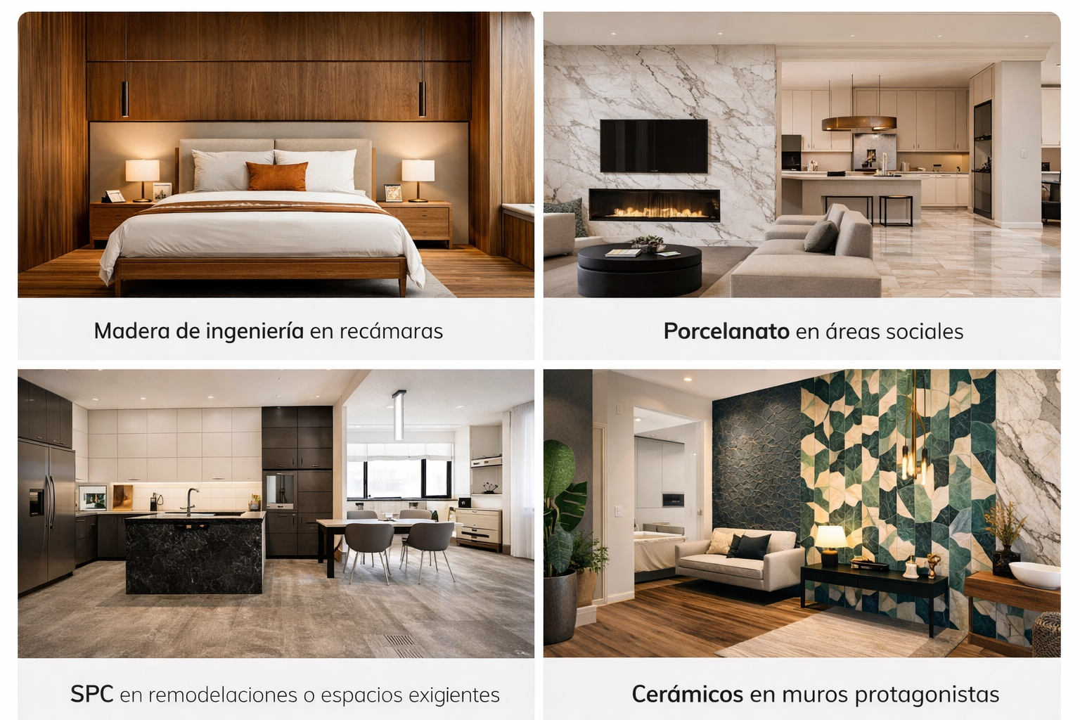 Materiales como el porcelanato técnico y los sistemas SPC (de baja absorción) ofrecen estabilidad en zonas húmedas o costeras. Para áreas con alta variabilidad térmica o riesgo estructural, la instalación flotante (SPC) o la madera de ingeniería aportan adaptabilidad.